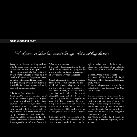 Every wood flooring, entirely realized led down or screwed on ap), on the laying an on the finishing.